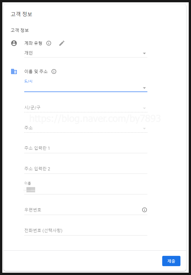특히나 주소는 이후에 애드센스 수익 지급에 있어서도 중요하게 확인해야 하는 부분이기 때문에 반드시 잘 확인하시고 '제출' 버튼 클릭하시기 바랍니다.