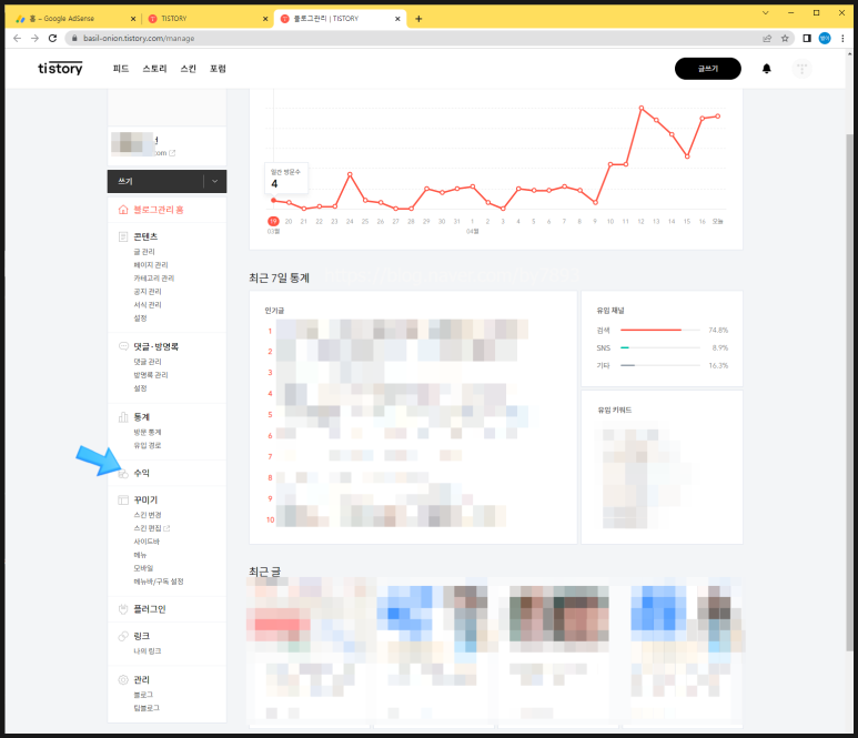 본인 계정의 홈에서 왼쪽 카테고리 중간에 위치한 '수익'을 클릭해주세요.