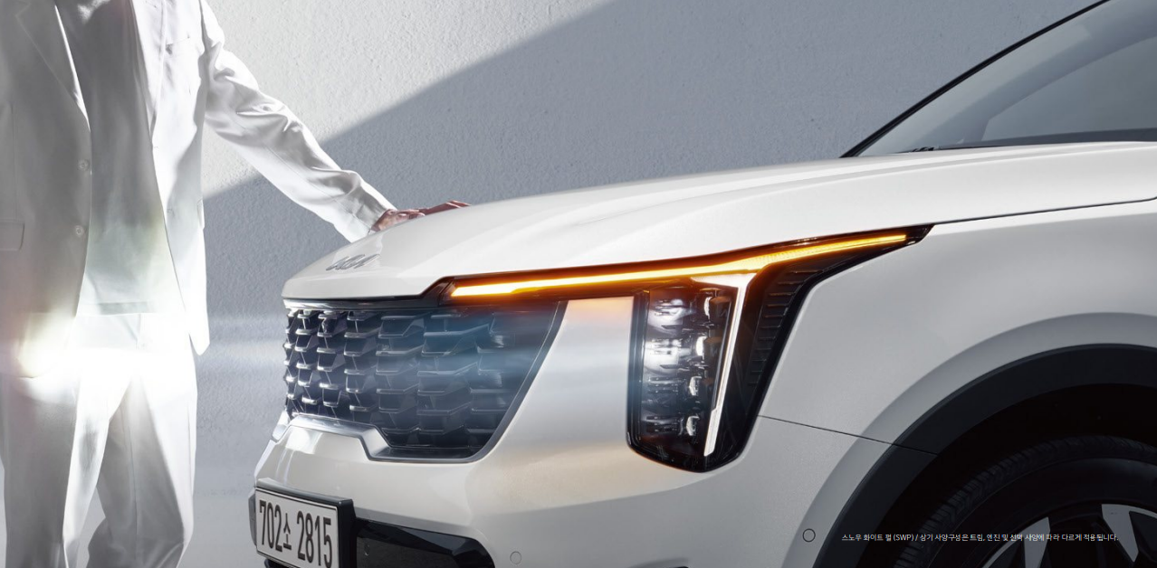 ● 자동차의 얼굴을 담당한다고 말해도 과언이 아닌 헤드램프와 라디에이터 그릴입니다. 이 전 2023 모델에서는 기아 로고가 라디에이터 중간에 있었던 것에 반해 이번에는 보닛 위로 올라가고 라디에이터도 간격이 보다 넓어지고 길어지면서 개인적으로는 훨씬 남성다운 와이드함이 느껴집니다.