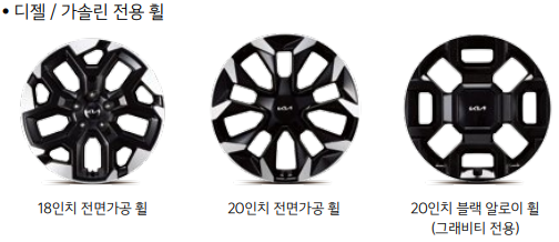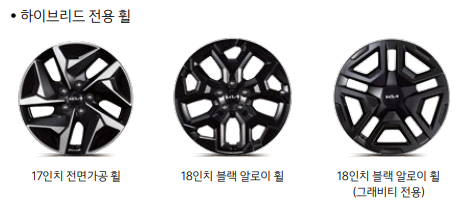 ● 쏘렌토 하이브리드 전용 휠에는 총 3종류가 있으며 17인치 전면가공 휠, 18인치 블랙 알로이 휠, 18인치 블랙 알로이 휠(그래비티 전용)이 있습니다.