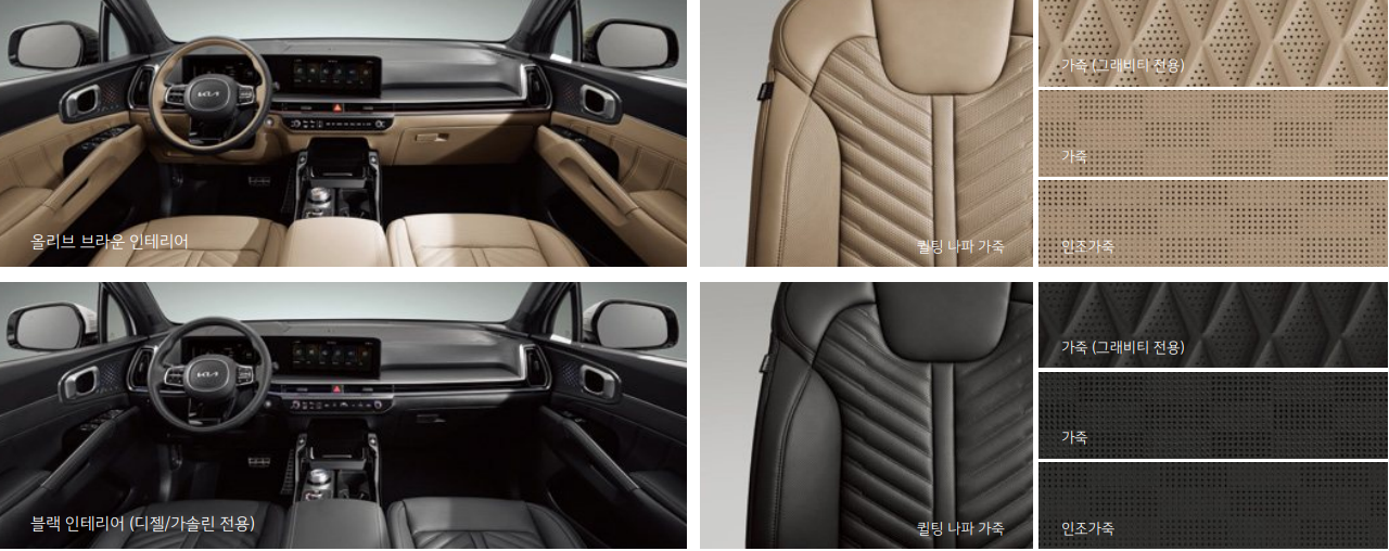 이 중 네이비&그레이 인테리어는 하이브리드 전용이며 블랙 인테리어는 디젤, 가솔린 전용입니다. 그러므로 그 이외에는 올리브 브라운 인테리어로 통일됩니다.
