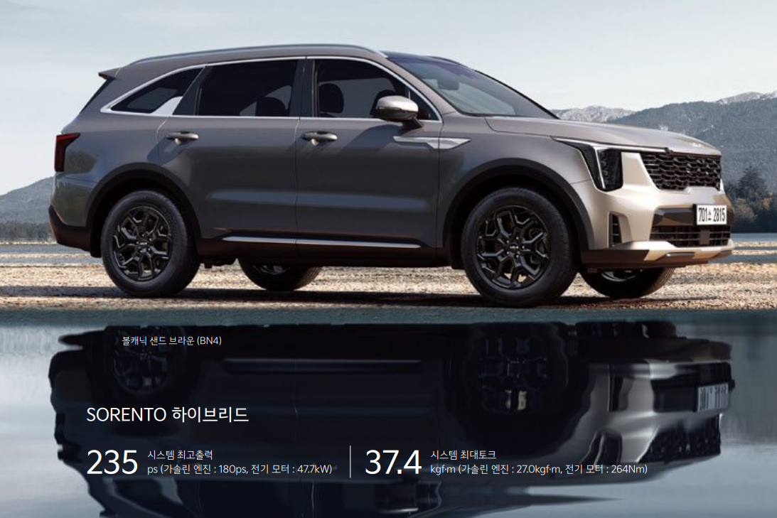 | 쏘렌토 하이브리드 1.6 HEV 가솔린, 하이브리드 15.7km/l , 235hp/180hp , 1,598cc |