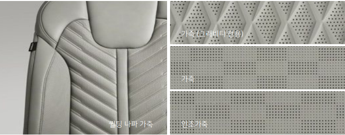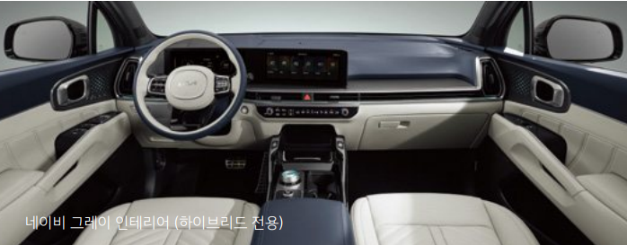● 쏘렌토 하이브리드 전용 차량 내부 인테리어 컬러는 네이비&그레이입니다. 가죽시트는 가죽 및 인조가죽이 혼용되어 있으며 퀼팅 나파 가죽, 가죽(그래비티 전용), 가죽, 인조가죽으로 이루어져 있습니다.