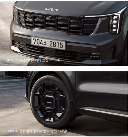 ● 쏘렌토 그래비티는 전용 블랙 알로이 휠과 그릴 디자인, 볼륨감 있는 그래비티 전용 가죽시트를 비롯해서 주요 외장 포인트를 블랙, 또는 다크 건메탈로 적용해 보다 더 볼드한 이미지를 연출합니다.