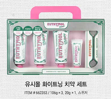 패키징도 깔끔하고 이뻐서 선물로도 좋은 유시몰 화이트닝 치약 세트입니다. 치약과 함께 스퀴저도 들어있어 활용도가 좋을 거 같아요. 금액은 32,990원으로 3만원이 넘는 가격대를 형성하고 있습니다.