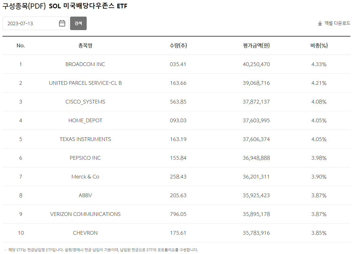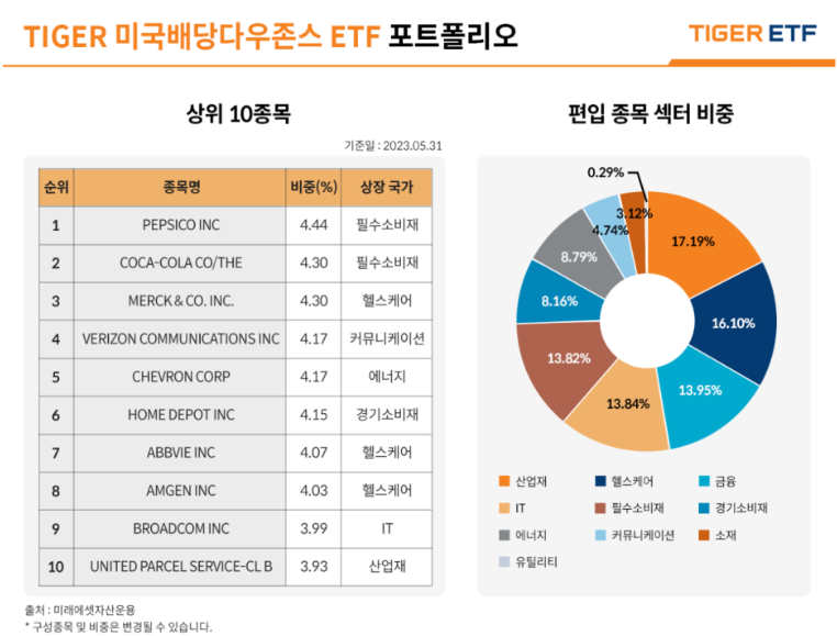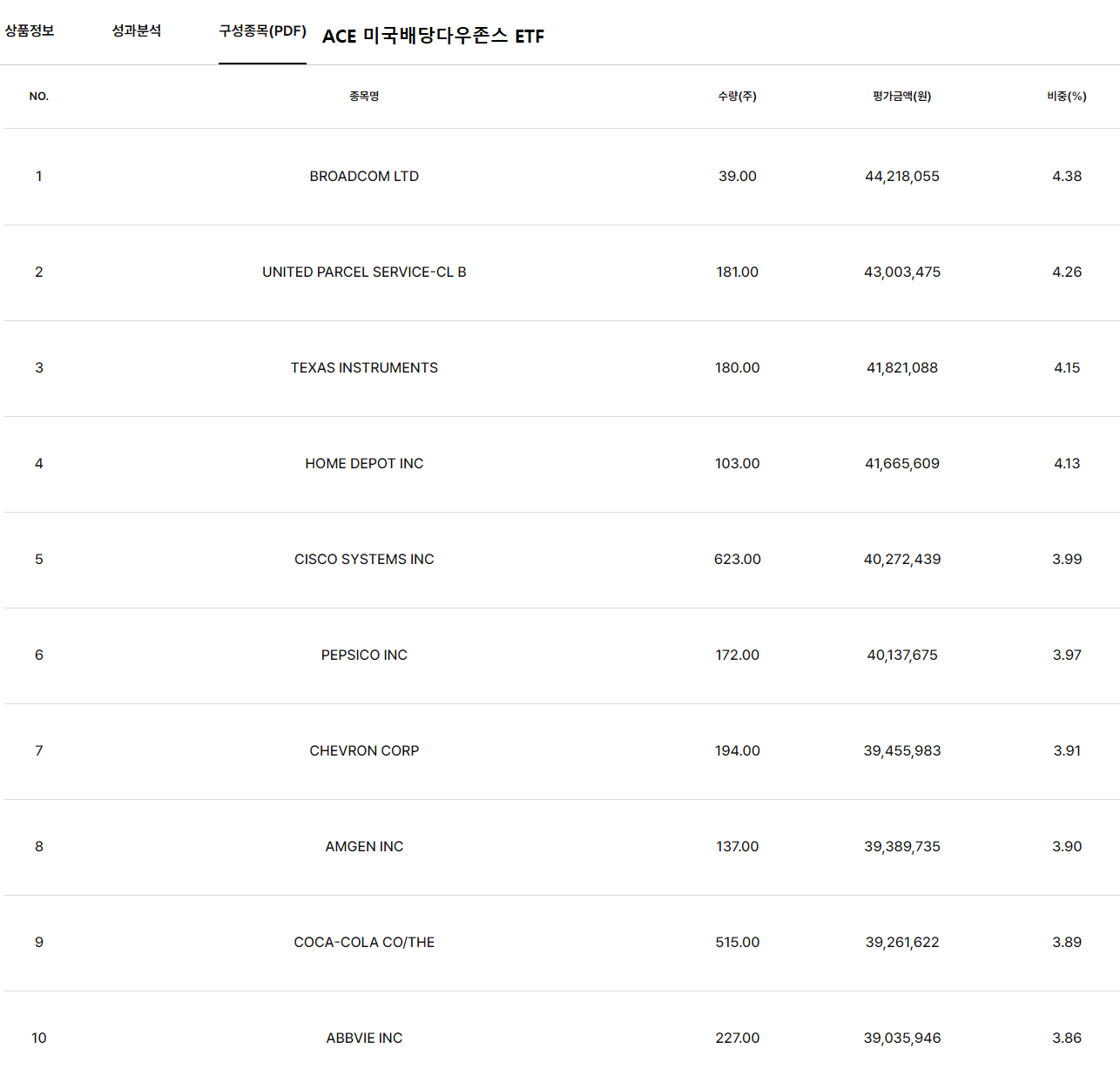 기본적으로 상위 10종목의 포트폴리오의 구성은 비슷하지만 차이점을 꼽으라면 비중을 들 수 있습니다. 예를 들어 펩시코(PEPSICO INC)의 경우 TIGER에서는 4.44%로 비중이 제일 높으며 SOL은 3.98%, ACE는 3.97%를 차지하고 있습니다.