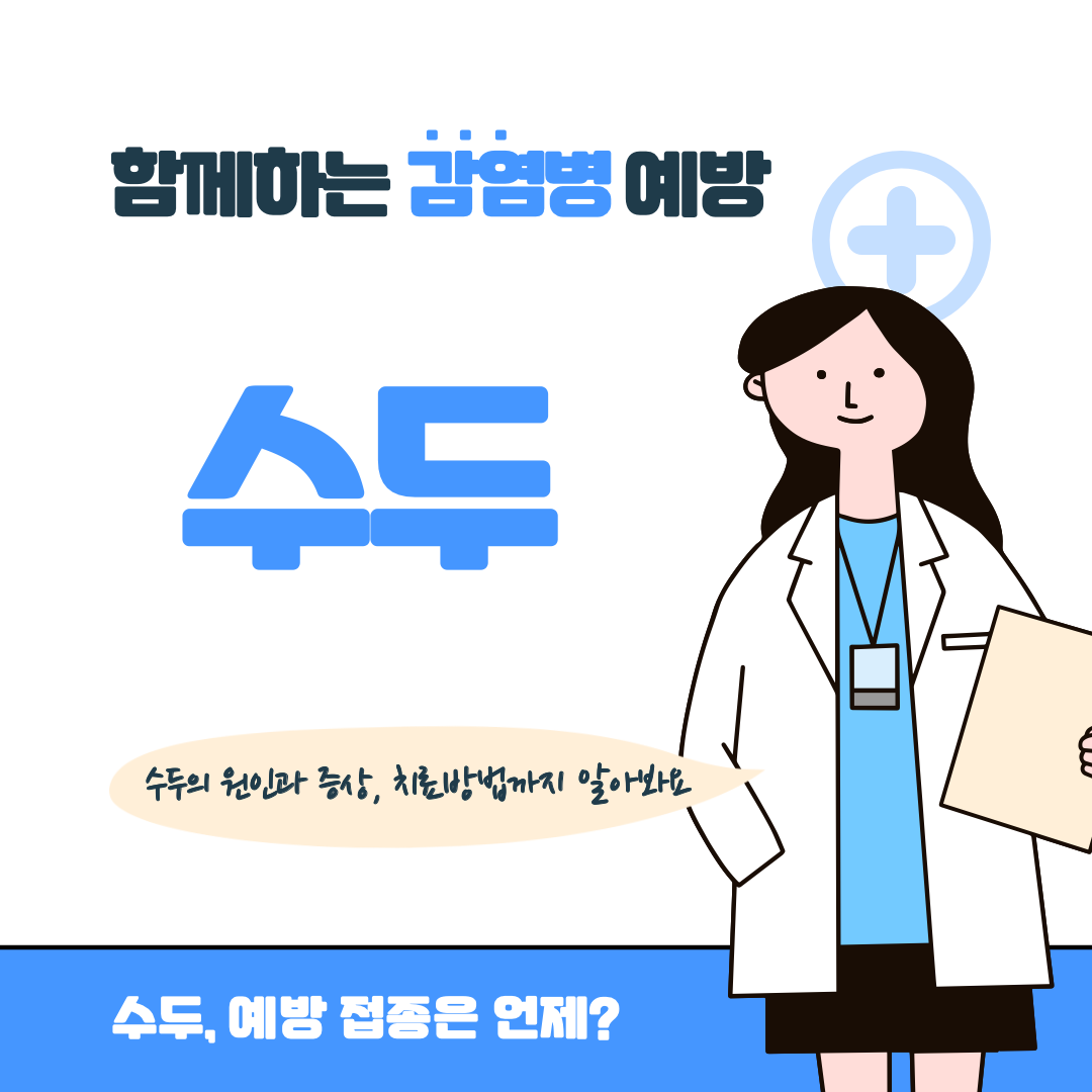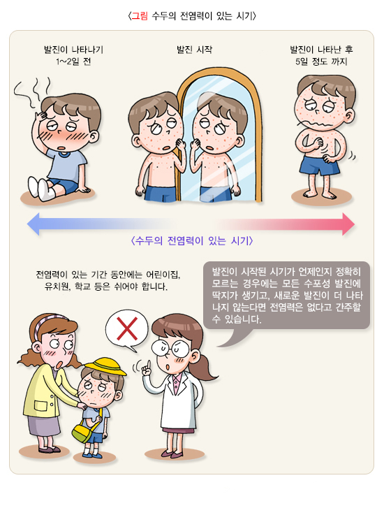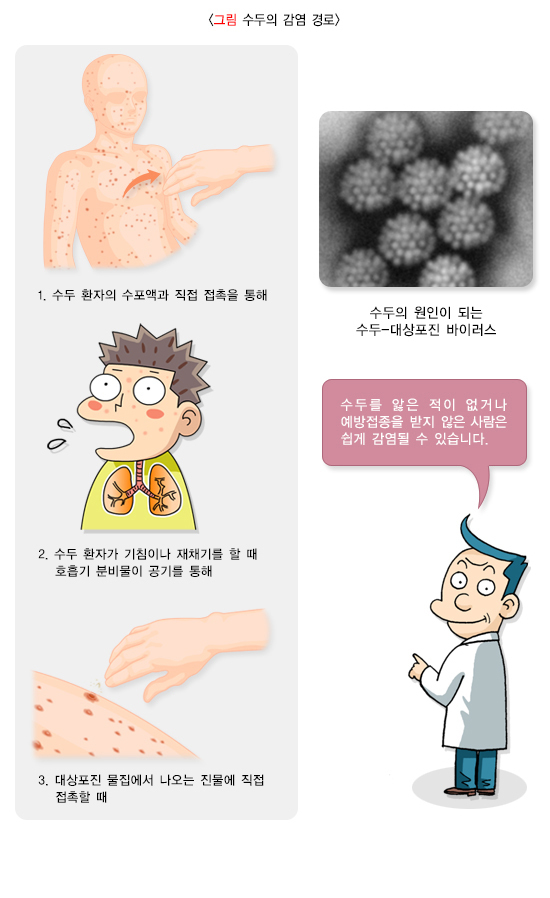 수두(varicella)는 수두 대상포진 바이러스에 의한 1차 감염으로 전염력이 매우 강한 급성 감염질환입니다. 수두는 수포가 초기에 생긴 것일수록 전염력이 강하고 딱지가 생기면 전파되지 않아, 전파 시기는 발진 발생 1~2일 전부터 발진이 딱지를 형성할 때까지이며(발진 발생 후 4~5일), 면역이 저하된 사람의 경우에는 새로운 병변이 발생하는 기간이 길어져 전파 기간이 더 길어질 수 있습니다. 수두에 감수성이 있는 사람(수두 백신 접종력이 없고, 과거에 수두를 앓은 적이 없는 사람)이 수두환자인 가족구성원과 접촉한 경우 수두 발생률은 90%입니다. 수두는 체액면역 및 세포매개면역 반응을 유도하여 증상을 동반하는 재감염에 걸리지 않게 하며, 수두 대상포진 바이러스에 대한 세포매개면역이 저하되면 대상포진이 발생할 위험이 커집니다. 대상포진은 면역기능이 정상인 사람에게서는 공기를 통해 바이러스를 전파시키지 않으나, 대상포진의 수포 병변이 바이러스를 함유하고 있으면 대상포진에 감수성이 있는 사람에게 바이러스를 전파시킬 수 있습니다.