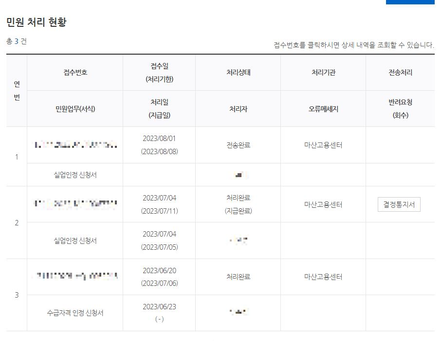 실업급여 신청과 관련한 모든 과정 및 민원 처리 현황은 고용보험 홈페이지에서 위와 같이 확인할 수 있습니다.
