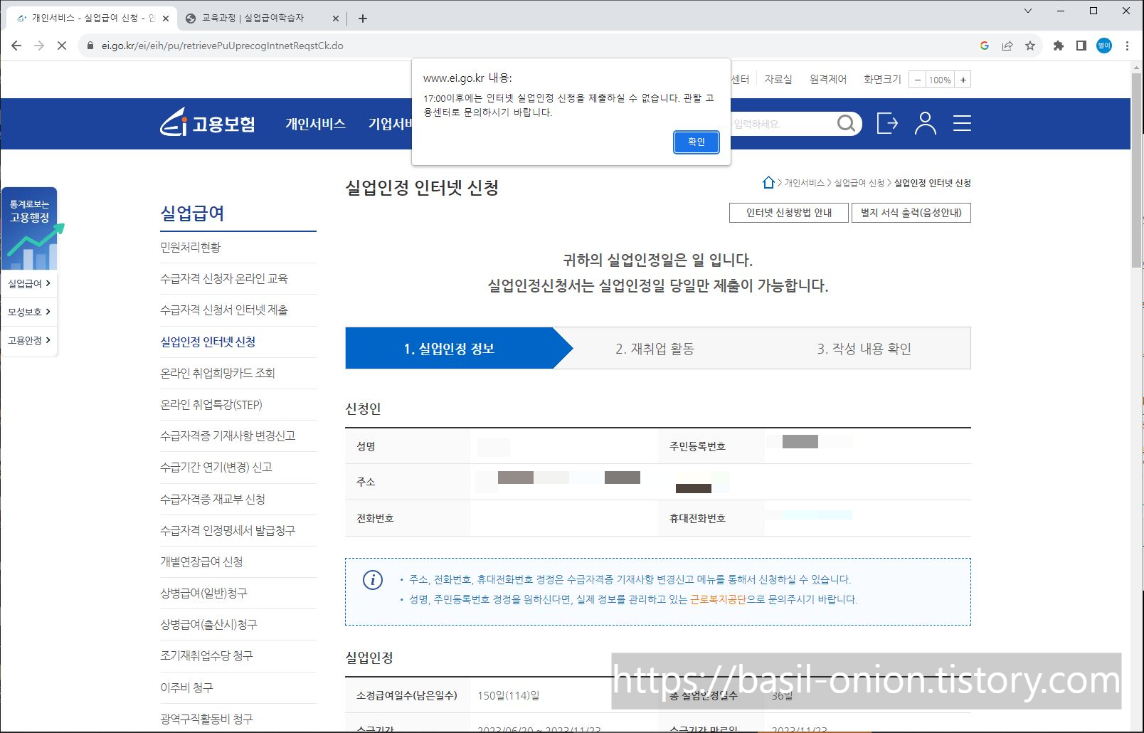 17:00 이후에는 인터넷 실업인정 신청을 제출하실 수 없습니다.