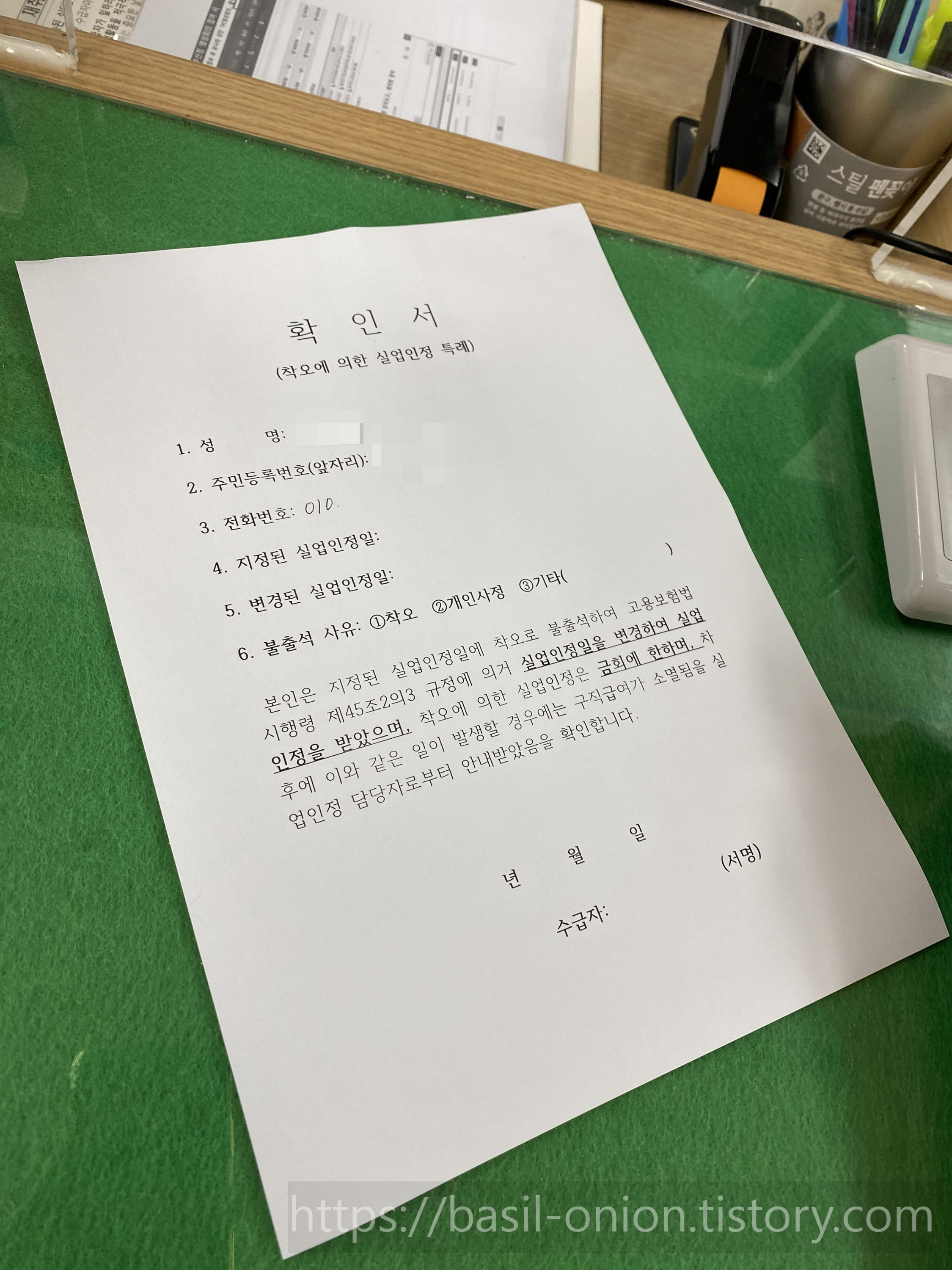 착오에 의한 실업인정 특례 확인서를 작성했습니다. 착오로 인한 불출석, 온라인 신청을 못했을 경우 실업인정일을 변경하기 위한 서류라고 합니다. 단, 실업급여를 받는 총 기간동안 1회에 한해서만 가능하며 저는 오늘 인정일을 변경하기 때문에 앞으로는 무조건 날짜를 지켜야 합니다.
