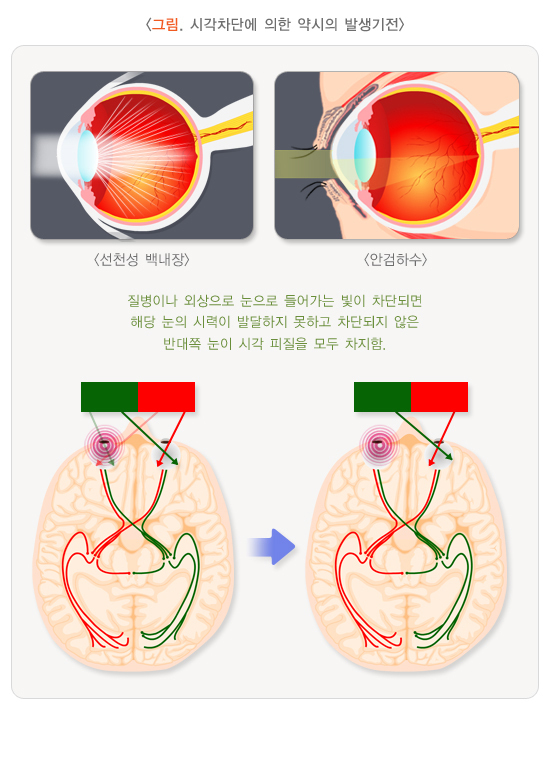 약시가 생긴 동물의 대뇌겉질에서는 양안시와 관련된 신경세포층과 약시안에서 나온 정보를 받는 신경세포층이 광범위하게 위축되어 있음이 보고되어 있습니다. 이렇게 두 눈 사이에 시각 피질을 지배하려고 하는 경쟁이 사람에서는 6세까지, 원숭이에서는 생후 6개월까지, 고양이에서는 생후 3개월까지 일어나기 때문에 이 시기에 눈을 가리면 시력발달이 되지 않습니다. 실제로 아기 고양이의 경우 한쪽 눈을 단 하루 동안 가려 놓아도 시력이 나빠진다고 합니다. 즉 이 시기에 선천성 백내장/녹내장, 안검하수, 안 외상 등으로 빛을 차단시키는 질환이 있으면 빨리 교정을 해 주어야 시력발달을 기대할 수 있습니다.