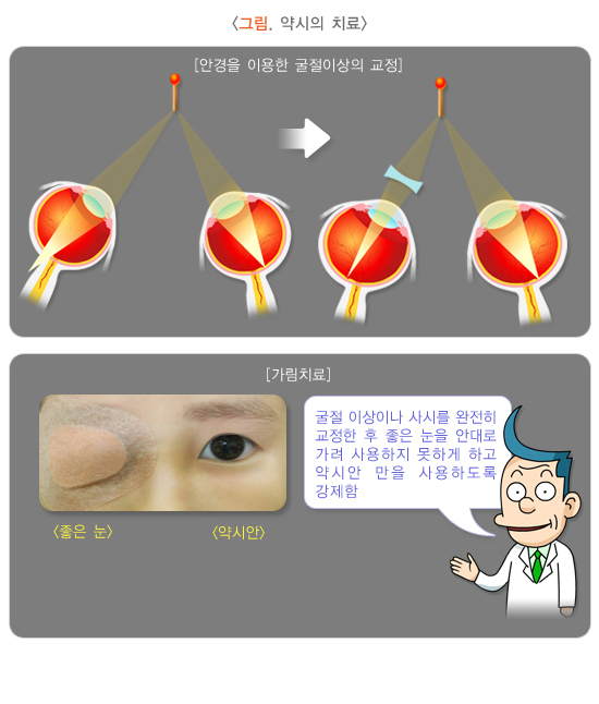 약시의 치료는 쉽게 말해 약시의 원인 인자를 제거함으로서 이루어지는데 크게 굴절 이상의 교정, 사시안의 교정, 가림 치료, 처벌 치료, 약물 치료로 나눌 수 있습니다.