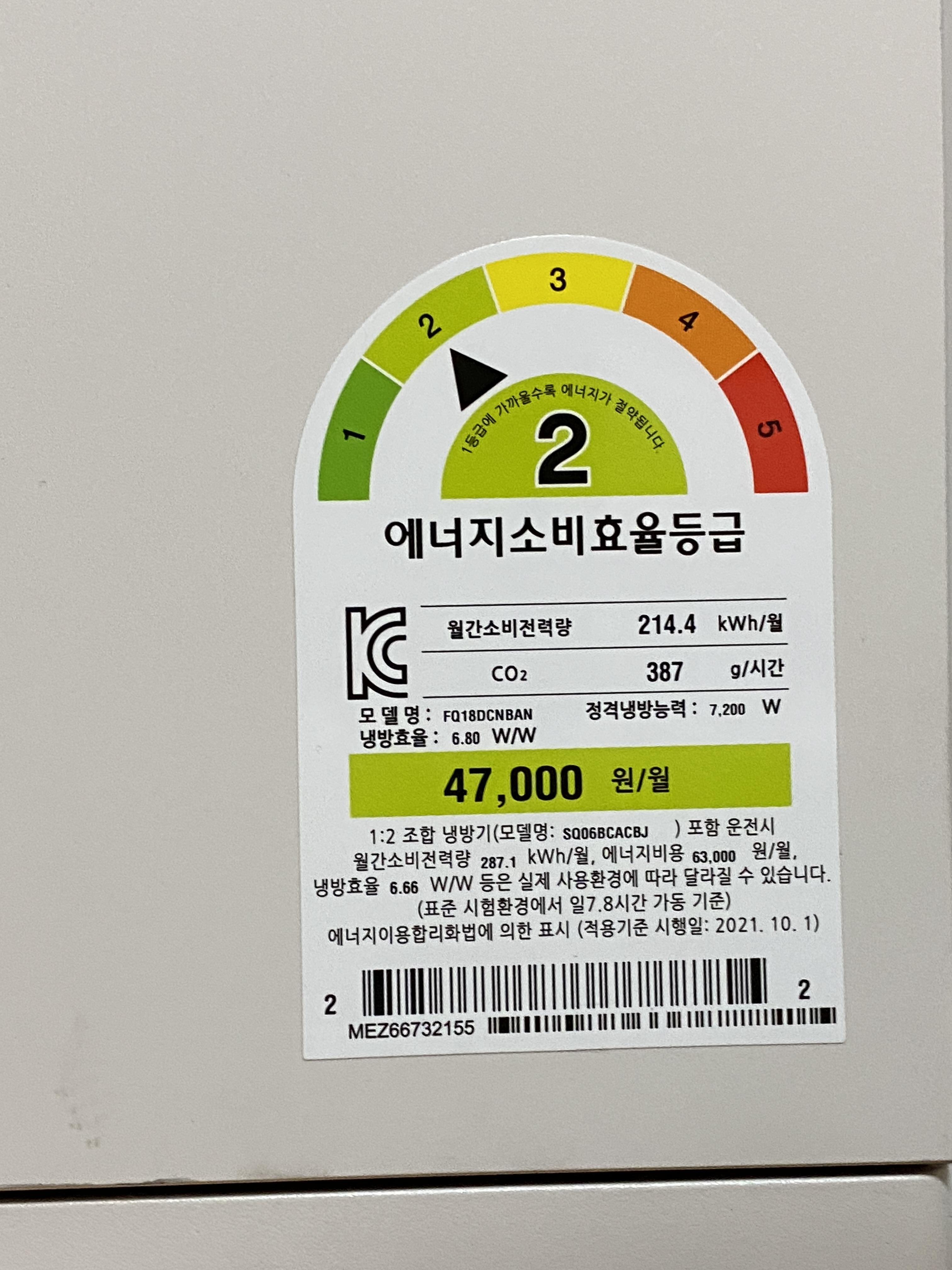 생산 연도를 모를 경우 간단하게 인버터 에어컨을 구분할 수 있는 또 다른 방법은 에너지소비효율등급을 통한 구분 방법입니다. 사용하는 에어컨의 에너지소비효율등급이 5등급이라면 정속형 에어컨입니다.