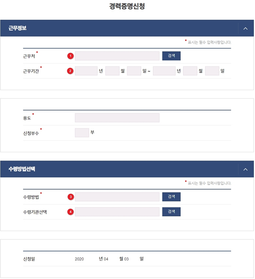 경력증명신청시 민원신청서 작성 예시는 아래 사진을 참고하시기 바랍니다.