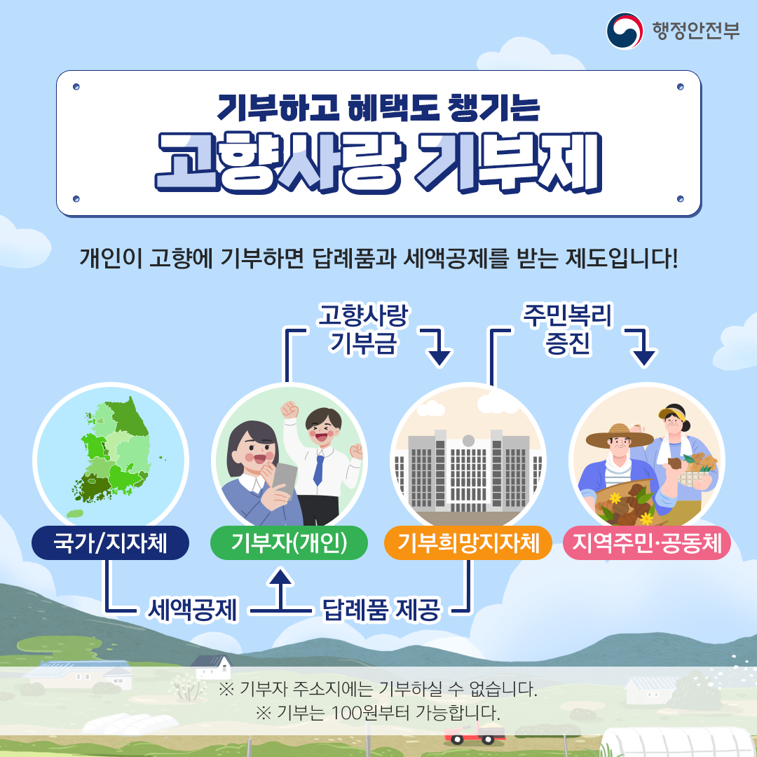 개인이 현재 등록되어있는 주소지를 제외하고 자신의 고향 또는 원하는 지방자치단체에 일정 금액을 기부하면 세액공제와 답례품을 받고, 뿐만 아니라 기부금은 주민의 복리와 지역 공동체 활성화에 사용되는 제도라고 합니다.