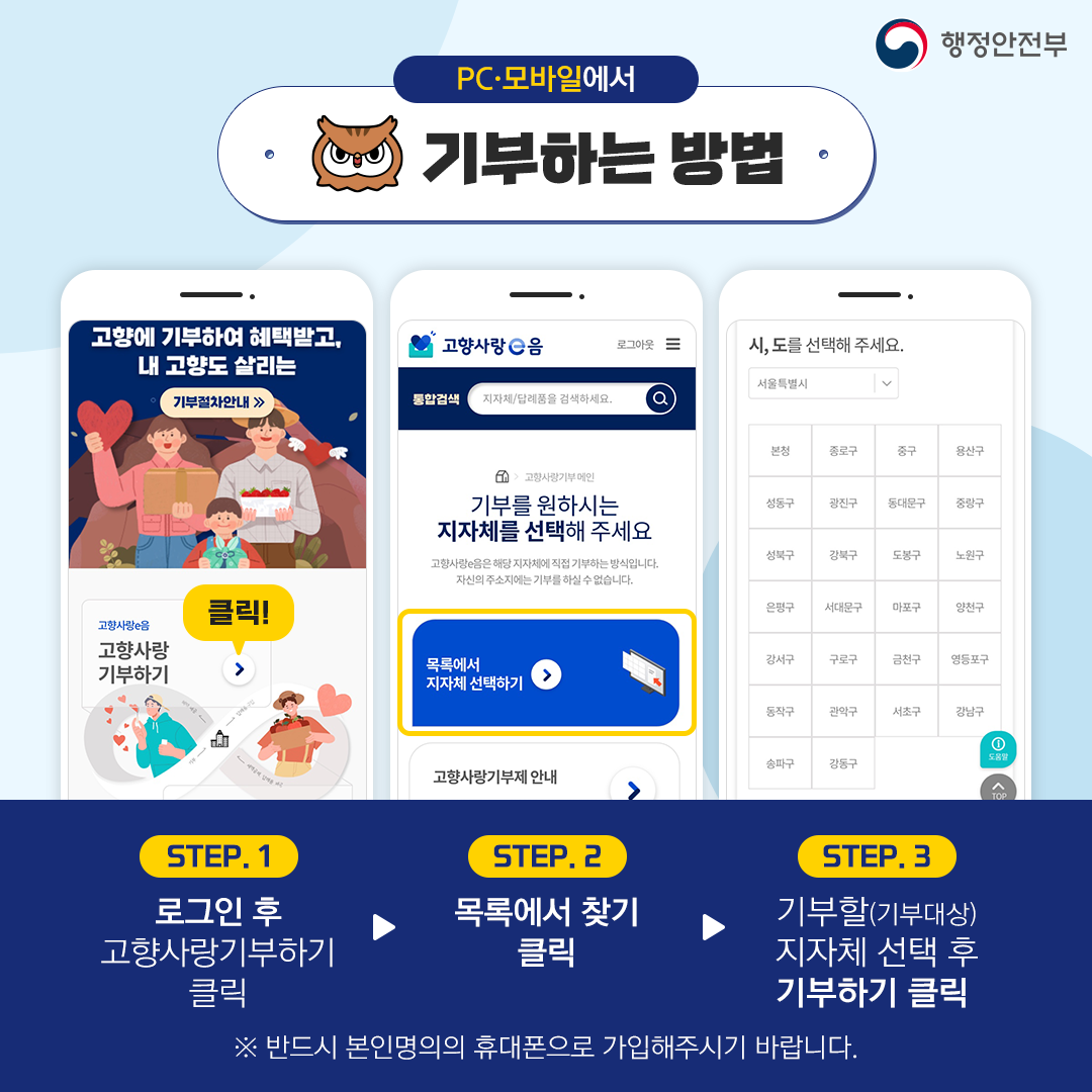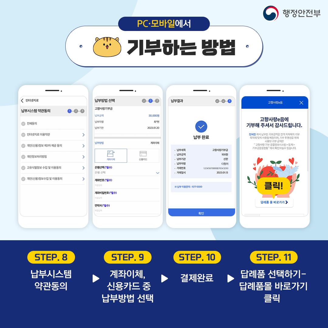 온라인 : 네이버, 다음(고향사랑기부제) 검색 > 고향사랑e음 회원가입 > 지자체 선택 > 기부할 금액 입력 > 기부금 납부(계좌이체/신용카드) > 답례품 선택하기 > 배송지 입력 > 주문 내역 확인