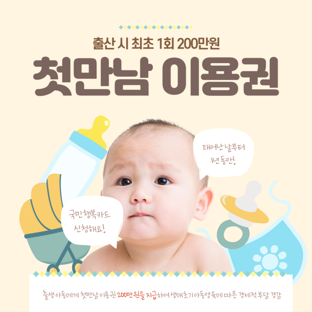 이에 정부에서는 출산 시 최초 1회 지급되는 바우처로 출산 축하 및 초기 육아 지원을 국민행복카드로 이용할 수 있는 서비스를 제공하고 있습니다. 국민행복카드 바우처 포인트로200만 원을 지급하니 반드시 받으셔서 사용하세요.