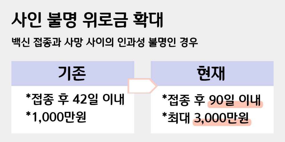 기존에는 42일 이내에 사망한 사람에게만 최대 1천만원을 지급했는데에 비해 대상자와 금액의 범위가 늘어났습니다.