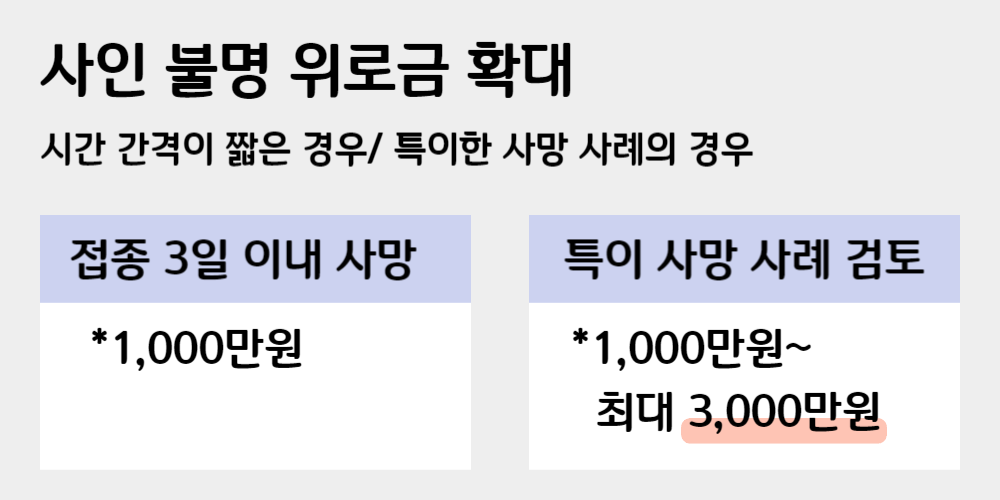 또한, 접종 3일 이내 사망과 같이 시간 간격이 짧은 경우에는 1천만원을 지급하며 특이한 사망의 사례인 경우에도 검토하여 최소 1천만원에서 최대 3천만원까지 지원하도록 합니다.