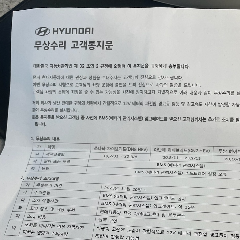 현재 현대, 기아 하이브리드 자동차 무상수리는 2023년 11월 29일부터 시작하였으며,
