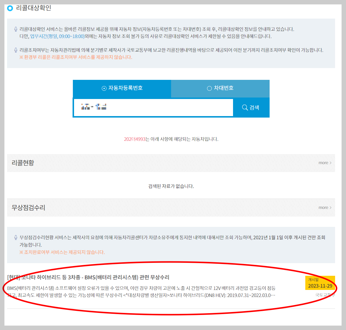 무상 수리 대상을 확인하는 방법은 어렵지 않습니다. 아래 사진은 제가 차량 번호로 조회를 해 본 결과입니다.