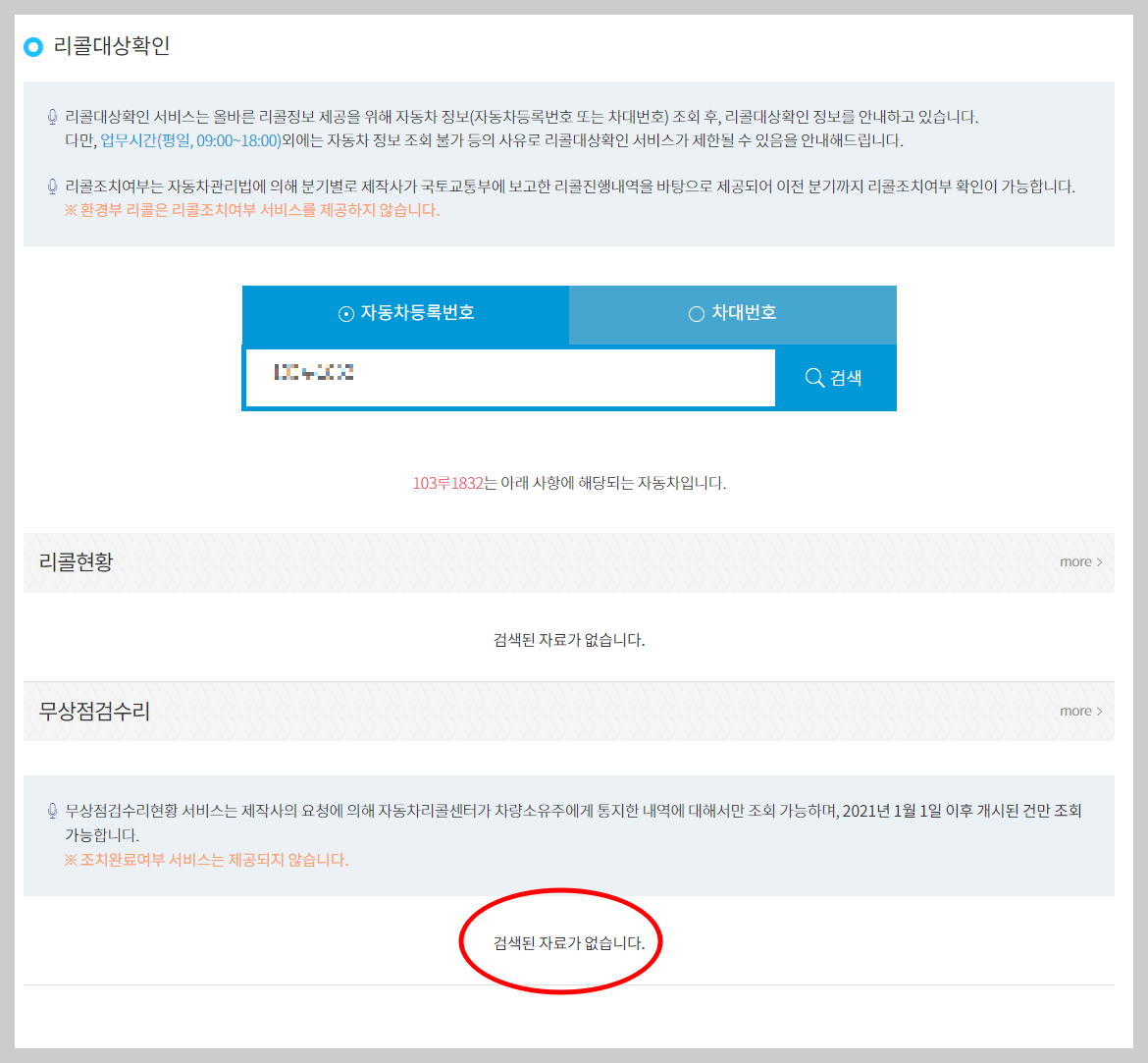 하지만 무상수리 대상이 아닌 차량의 경우에는 3번째 사진의 동그라미처럼 아무런 자료가 나오지 않습니다.