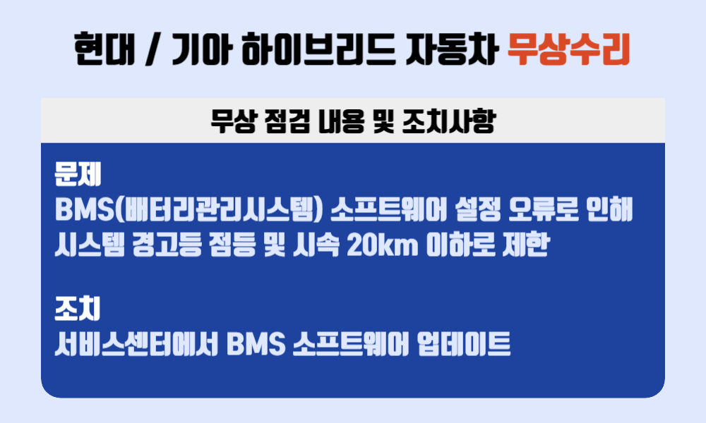 현재 무상수리 대상인 현대·기아의 하이브리드 자동차의 문제점은 BMS 소프트웨어 설정 오류로 하이브리드 시스템 경고등이 켜짐과 함께 시속 20km 이하로 속도가 제한된다는 점입니다. 도로 위에서의 속도 제한은 큰 사고로 이어질 수 있기 때문에 매우 위험합니다. (저희 사촌동생이 겪었던 상황과 동일합니다.)