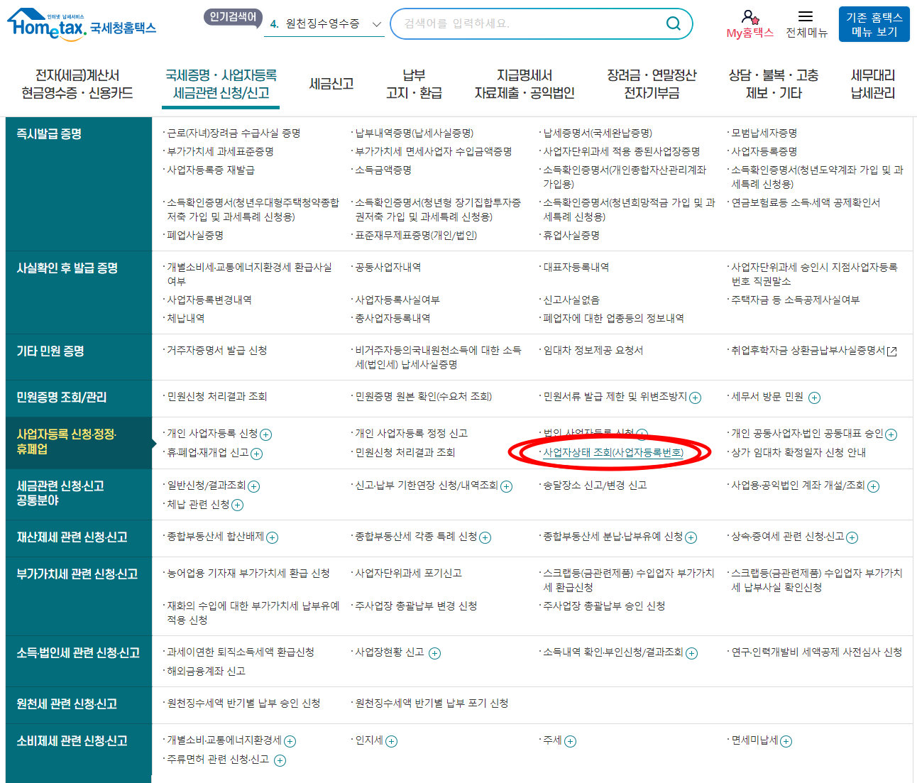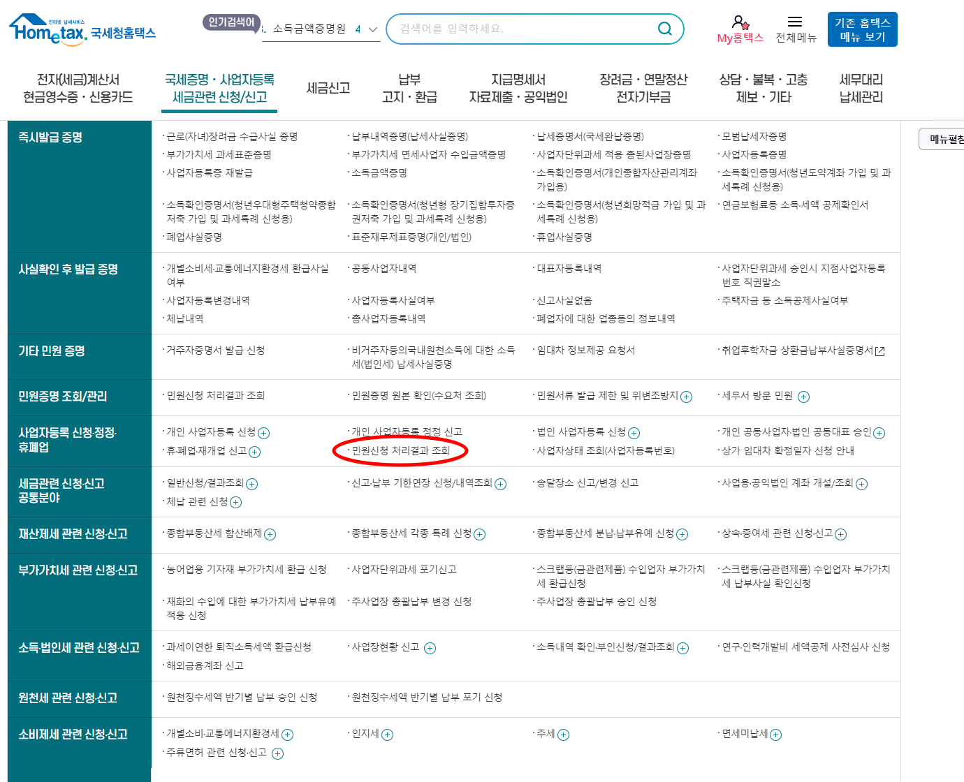 국세증명·사업자 등록 세금관련 신청/신고 > 사업자등록 신청 ·정정 ·휴폐업 > 민원신청 처리결과 조회