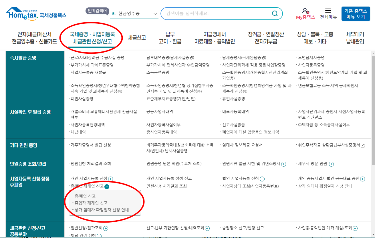 그럼 아래 항목들 중에서 휴·폐업·재개업 신고를 클릭합니다.