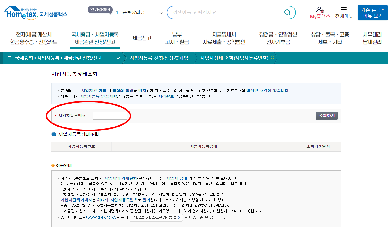 전과 동일하게 국세증명·사업자 등록 세금관련 신청/신고 > 사업자등록 신청·정정·휴폐업 카테고리에서 사업자상태 조회(사업자등록번호)를 클릭합니다. 그럼 오른쪽 사진처럼 사업자 등록번호를 조회하는 화면이 나옵니다.