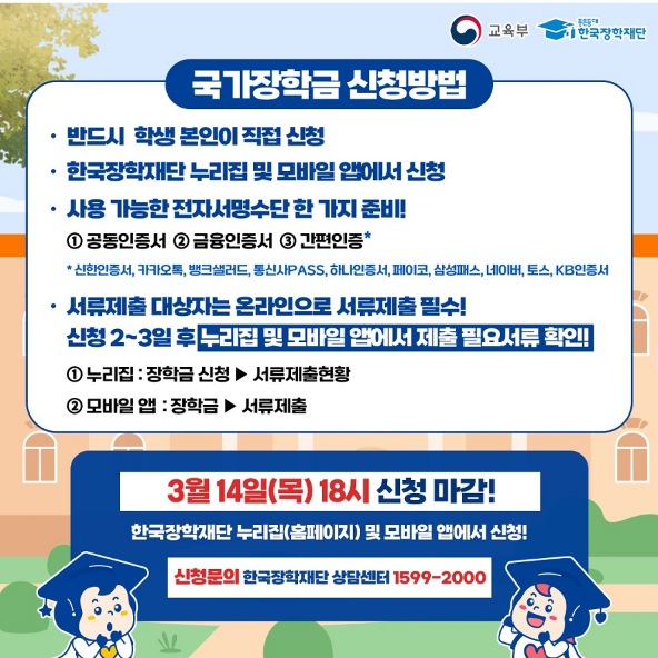 마감 이후 국가장학금 신청은 불가하기때문에 반드시 기간 내 신청하셔야 합니다.