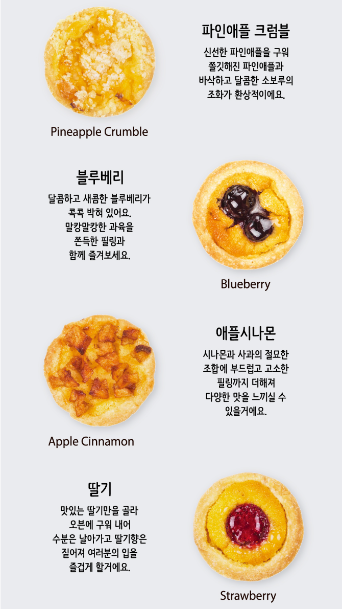 지름 5cm 한 입 크기의 타르트로, 애플시나몬 4개, 블루베리 4개, 파인애플크럼블 4개, 딸기 4개 총 4가지 맛, 16개로 구성되어있어요.
