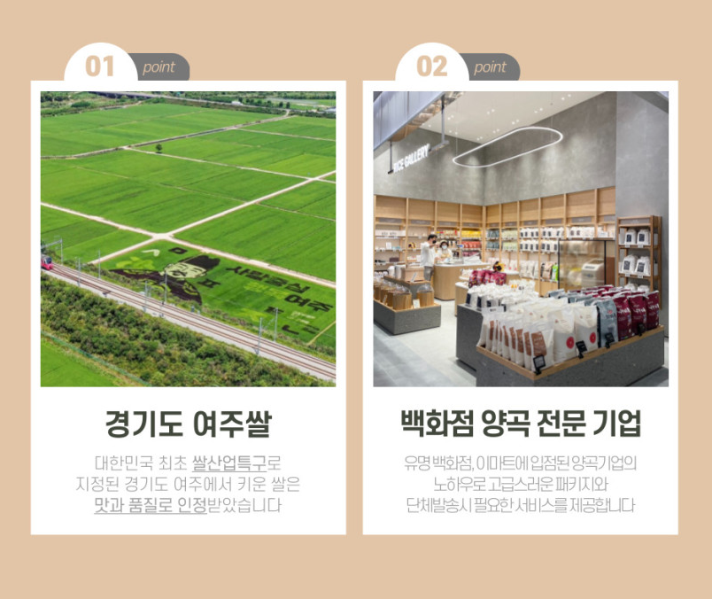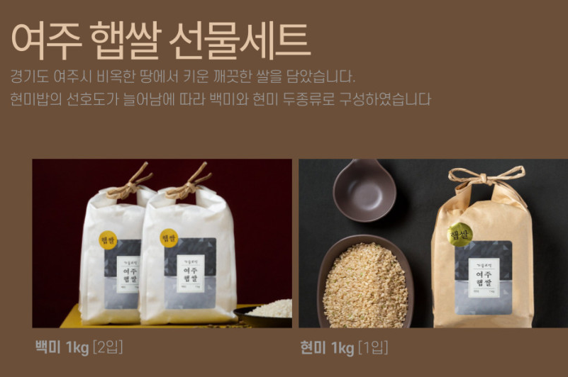 여주햅쌀 선물세트는 경기도 여주시 비옥한 땅에서 키운 깨끗한 쌀을 담은 선물로써 현미밥의 선호도가 늘어남에 따라 백미와 현미 두 종류로 구성도이어있습니다. 백미1kg 2입, 현미1kg 1입으로 구성되어있습니다.