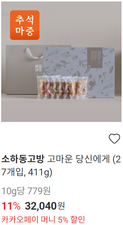 특히나 명절 선물은 무엇보다도 포장이 예뻐야 하잖아요?! 포장에서 풍겨오는 명절 분위기로 주는 사람, 받는 사람 모두 기분이 좋아지기 때문인데요. 두 번째로 추천하는 추석 선물은 롯데백화점의 소하동고방입니다.