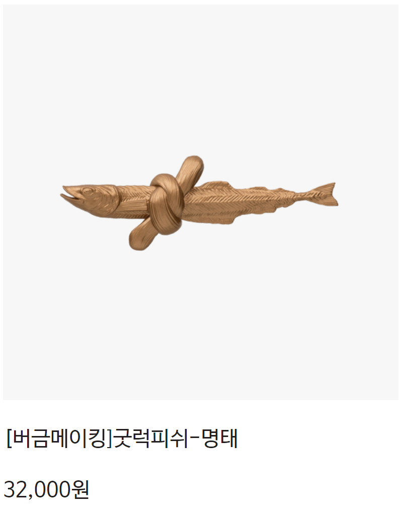 먹는 선물이 아니라 오래도록 볼 수 있는 선물을 원하신다면 현대백화점에서 판매중인 버금메이킹의 굿럭피쉬-명태를 추천합니다. 복을 기원하며 일이 술술 잘 풀리기를 기원하는 마음으로 귀한 명주실을 명태에 감아 대문에 매달았던 우리 고유의 풍습을 담은 오브제입니다.