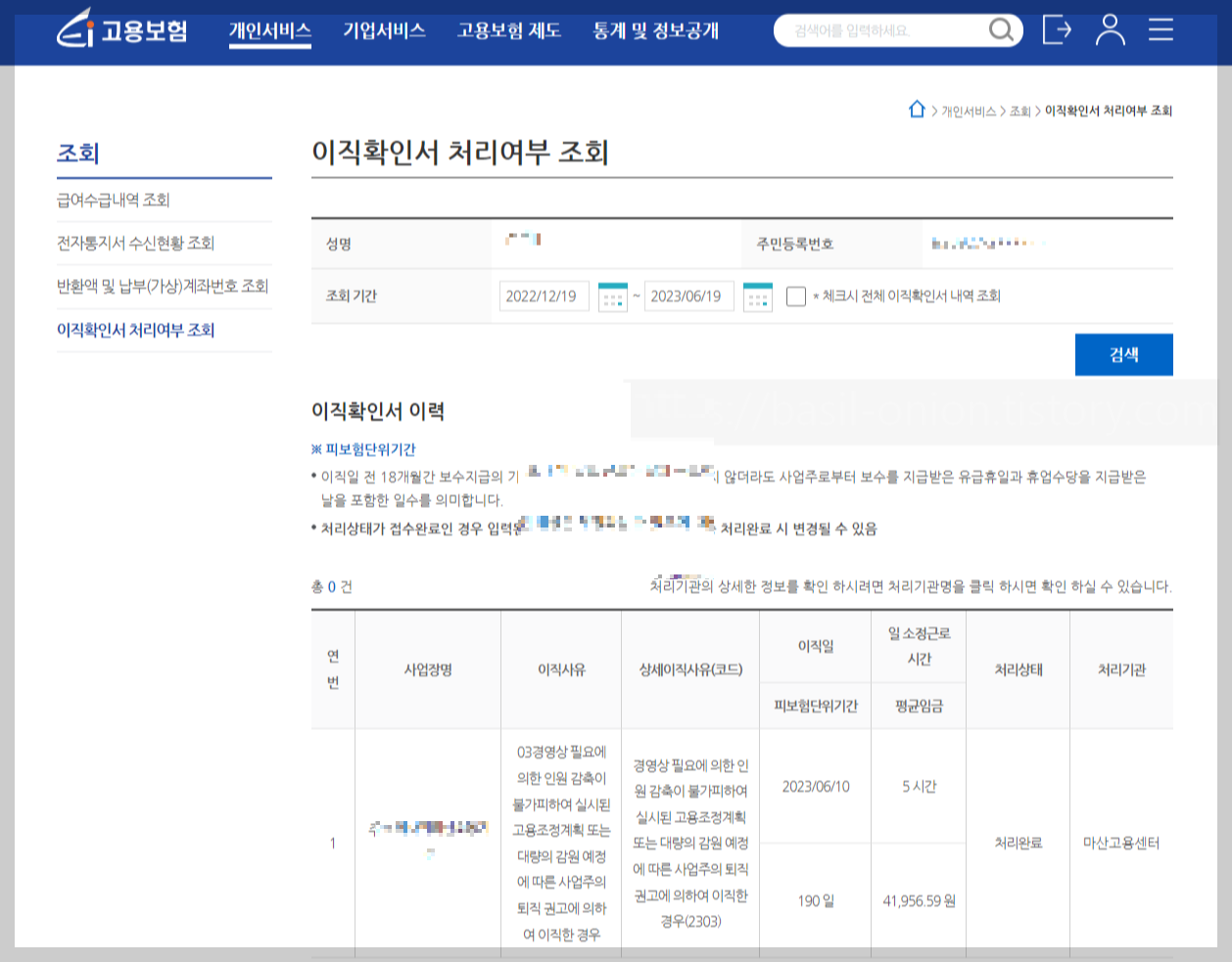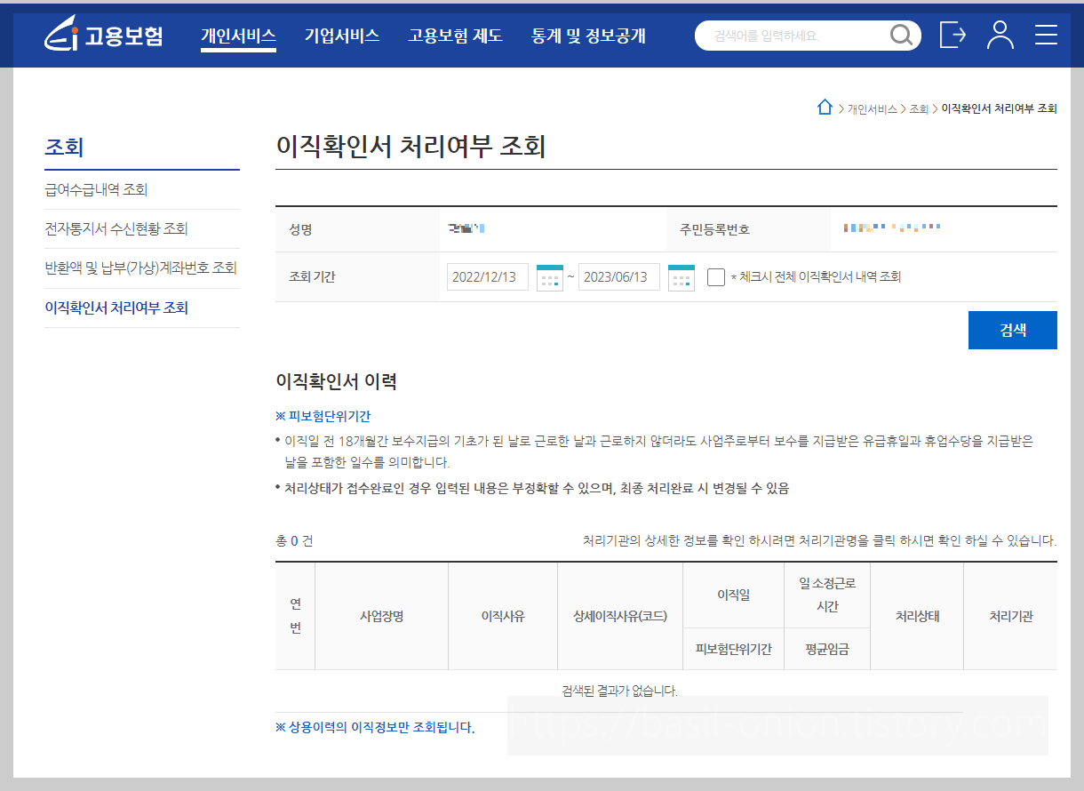 바로 고용보험-개인서비스-조회-이직확인서 처리여부 조회를 통해 확인할 수 있습니다. 고용보험 홈페이지에서 가입을 해야만이 조회가 가능하며 실업급여 신청 또한 고용보험 홈페이지에서 이루어지므로 반드시 회원가입을 하신 후에 진행하시기 바랍니다.