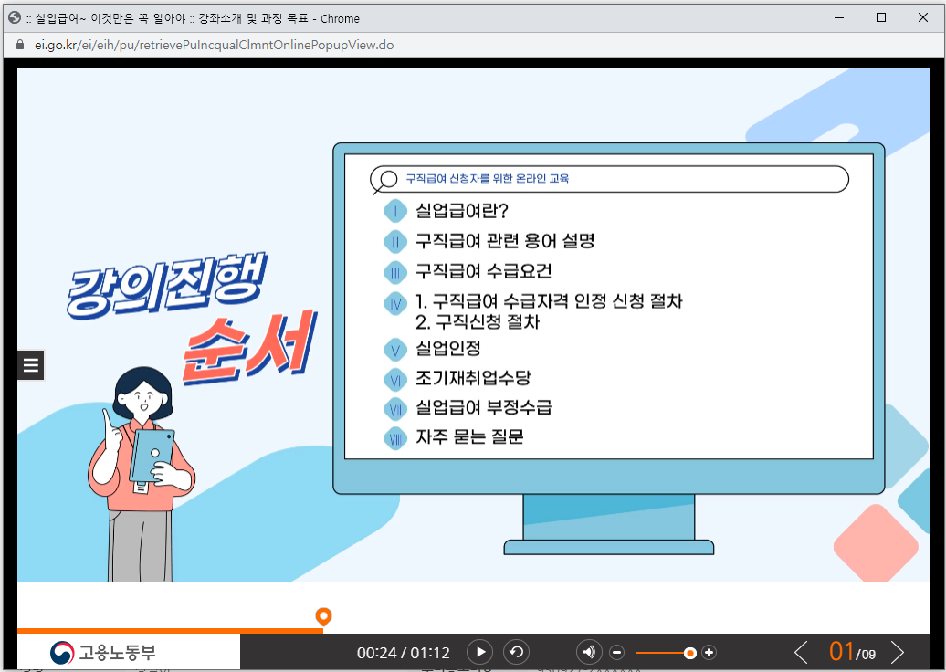 수급 자격 신청자 온라인 교육은 고용 보험 홈페이지에서 이루어집니다. 아래 링크를 눌러 고용보험으로 바로 이동하세요.