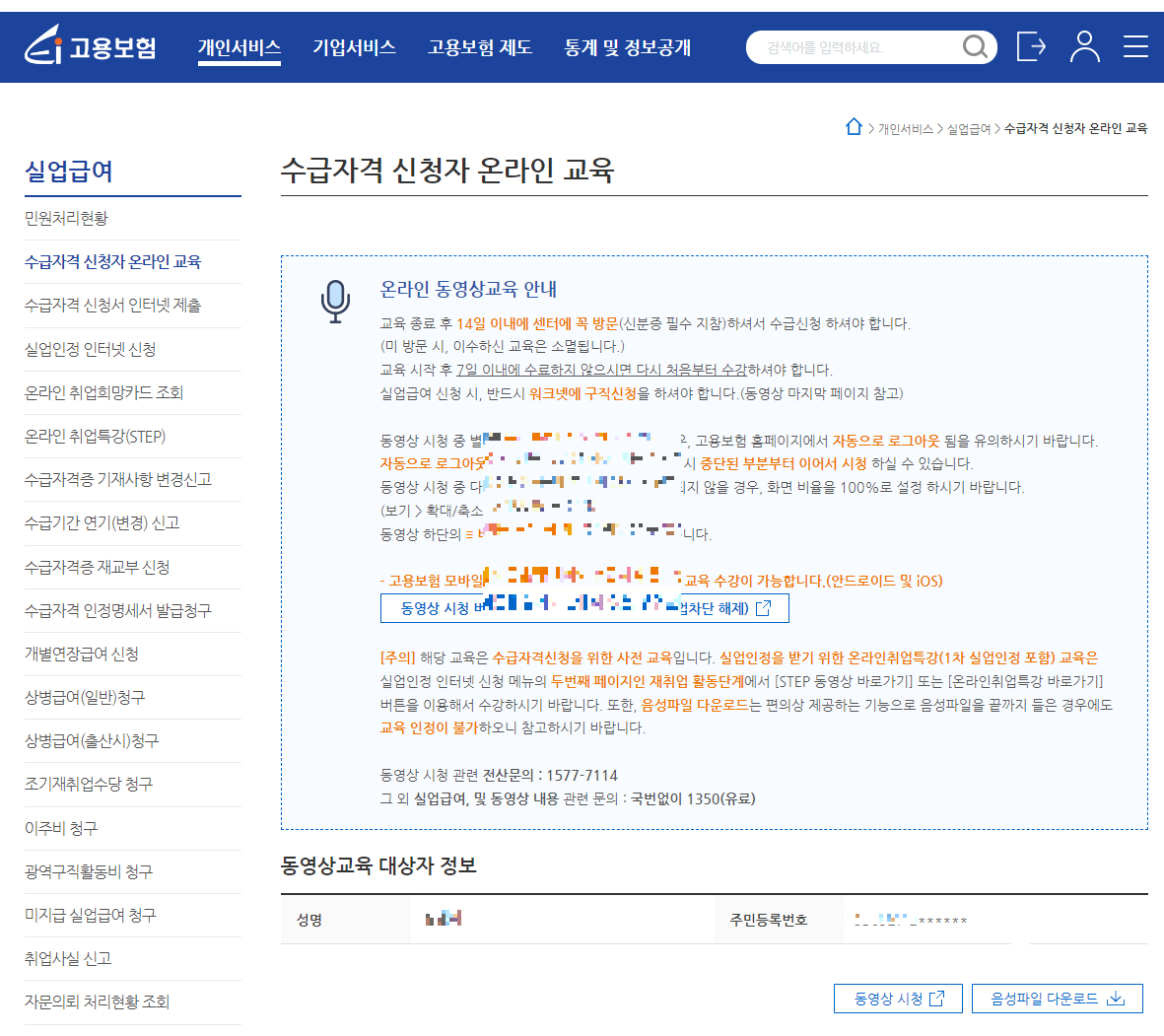 수급자격 신청자 온라인 교육은 고용보험 홈페이지-개인서비스-실업급여-수급자격 신청자 온라인 교육 탭으로 들어가시면 됩니다. 아래쪽에 보시면 동영상 교육대상자 정보란에 자신의 이름이 기입되어 있는 것을 확인해보실 수 있습니다.