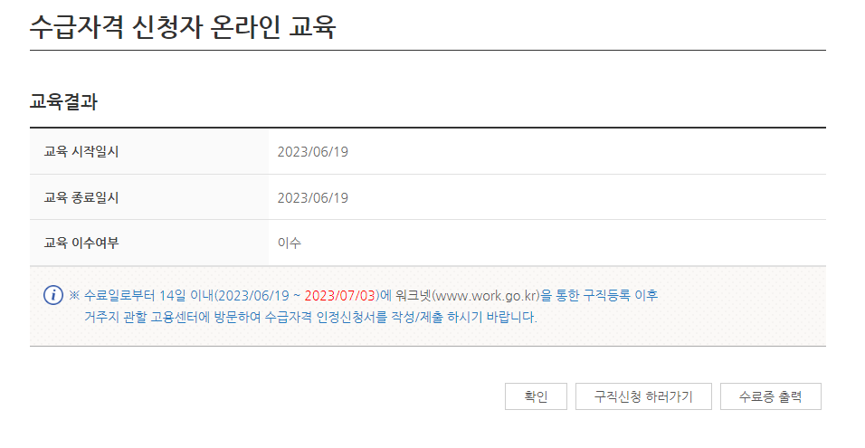 *수료일로부터 14일 이내에 워크넷을 통한 구직등록 이후 거주지 관할 고용센터에 방문하여 수급자격 인정신청서를 작성/제출해야 한다고 합니다.