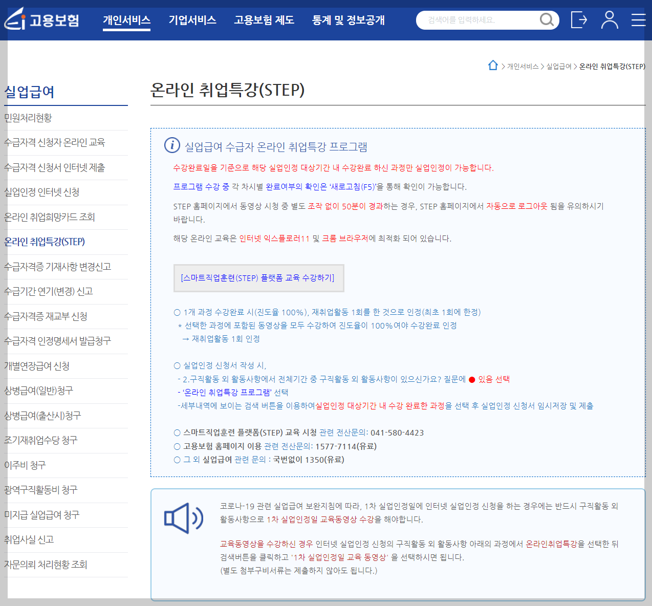 고용보험 홈페이지 접속 후 로그인 > 개인 서비스 > 실업급여 온라인 취업특강(STEP) > 1차 실업인정 교육 동영상 시청