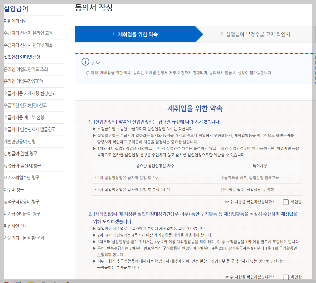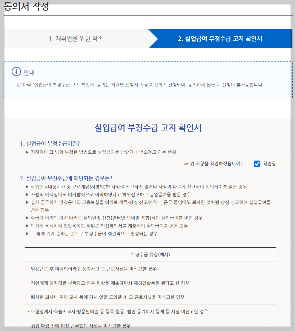 먼저는 동의서를 작성하게 됩니다. 동의서 작성은 첫 번째, 재취업을 위한 약속과 두 번째, 실업급여 부정수급 고지 확인서 두 가지로 이루어져 있습니다. 어렵거나 복잡하지 않아서 가볍게 읽어보시고 확인함에 체크 후 넘어가시면 됩니다.